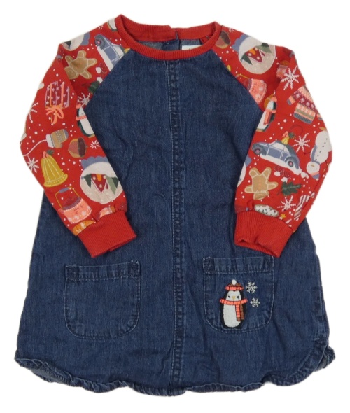 Tmavomodré ľahké rifľové šaty s červenými teplákovými rukávy s vánočními obrázky Next