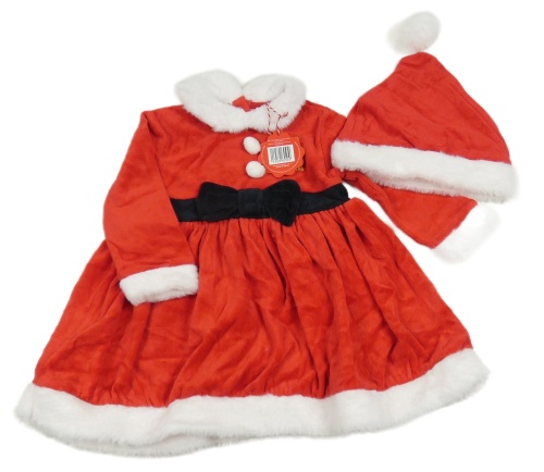 Nové - 2 set - Červeno-biele zamatové šaty s kožušinovými prvky + čapica s bambulí - Paní Santová