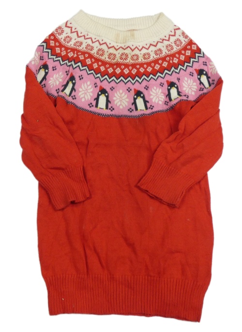 Červeno-ružovo-smotanové pletené šaty s tučňáčky a vločkami a vzorom St. Bernard