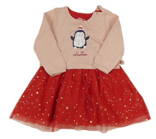 Pudrovo-červené teplákovo/tylové šaty s tučňáčkem a zlatými hviezdičkami C&A