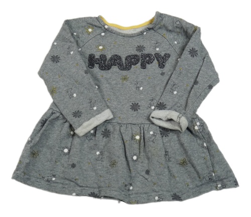 Tmavošedo-biele pruhované bodkovaná é teplákové šaty s nápisom a kvetmi a králíčky NUTMEG