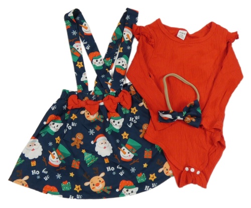 • 3set - Tmavomodrá sukňa s vánočním motívom a kšandami + červené rebrované body s volánky + čelenka Shein