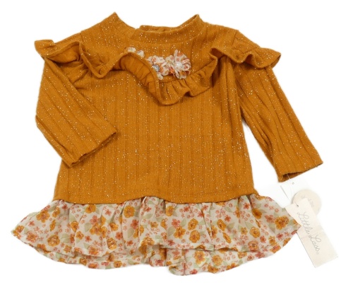 • Nové - hořčicovo-smotanová trblietavá rebrovaná šatová úpletová tunika s kvetmi a volánikmi Little Lass