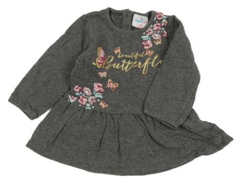 Tmavosivé melírované teplákové šaty so zlatými nápisy a motýlikmi a kvietkami Topomini