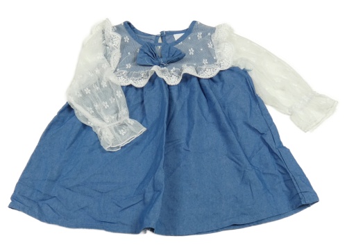 Modro-biele riflovo/krajkové šaty s mašlou a kvetmi a bodkami a volánikmi
