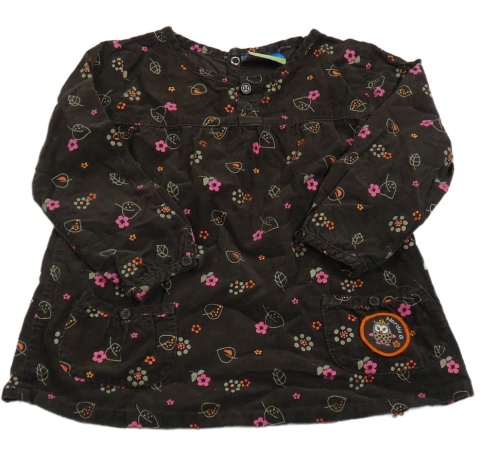 Tmavohnedá menšestrová šatová tunika s lístečky a kvietkami a sovičkou Topolino