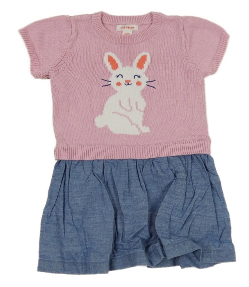 Svetloružové pletené šaty so zajícem a riflovou sukní