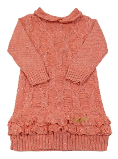 Korálové trblietavé svetrové šaty s volánikmi a golierikom