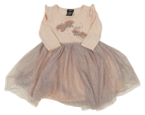 Světlebroskvové šaty s vážkami a kamienky a starofialovým tylem s bodkami a volánikmi zunie