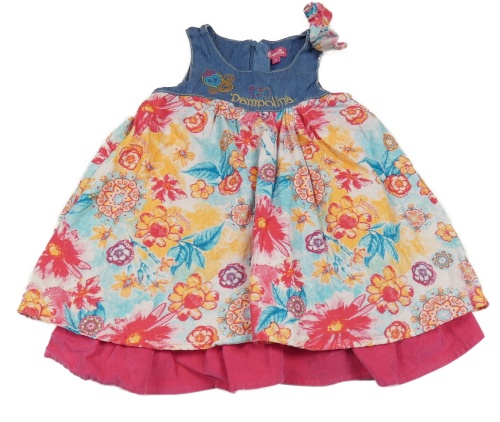 Modro-ružovo-farebné kvetované manšestrovo/riflové šaty s nápisom