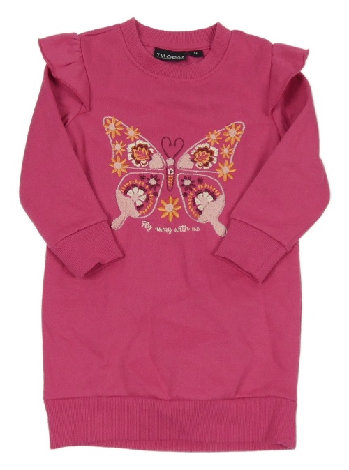 Fuchsiové teplákové šaty s motýlem z květin a volánikmi