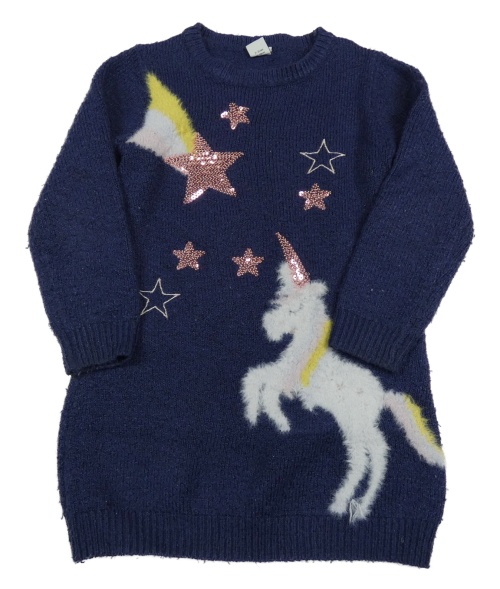 Tmavomodré svetrové šaty s jednrožcem a hvězdami z flitrů Tu
