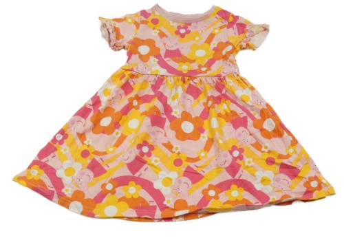 Svetloružová -malinovo-tmvooranžovo/žluté vzorované šaty s Peppa Pig a kvetmi a volánikmi St. Bernard