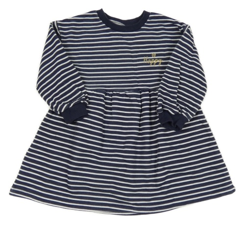 Tmavomodro-biele pruhované bavlnené šaty so zlatým nápisom
