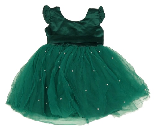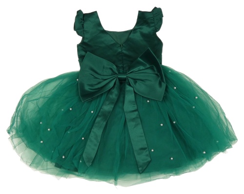 Tmavozeleno-smaragdové tylovo/saténové šaty s perlami a volánikmi a mašlou