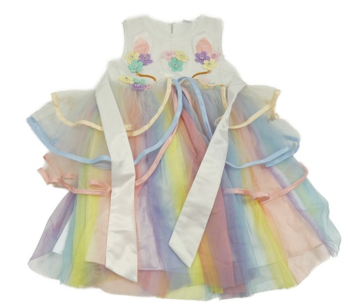 Bielo-farebné pastelové tylové slávnostné šaty s jednorožcom a opaskom