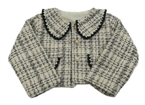 Béžovo-čierno-biele kockované trblietavé crop sako s golierikom