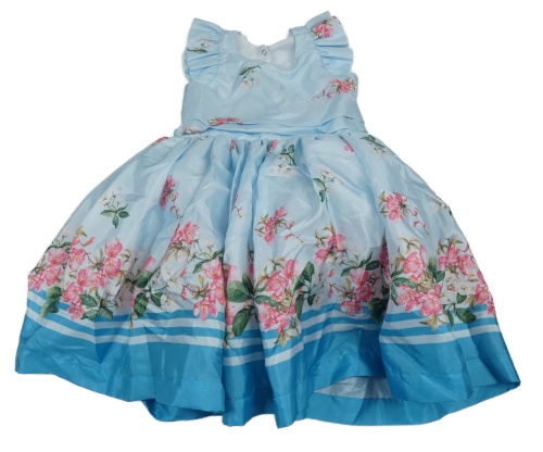 Světlemodro-modré šušťákové slávnostné šaty s kvietkami a volánikmi