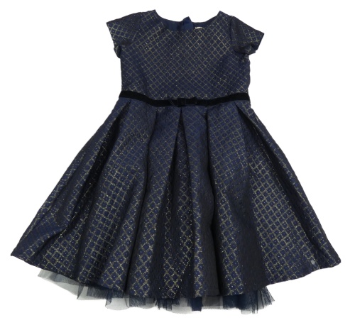 Tmavomodro-zlaté vzorované spoločenské šaty s mašličkou