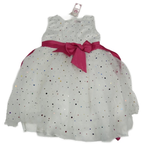 Nové - Biele vzorované trblietavé tylové slávnostné šaty s ružovou mašlou a opaskom