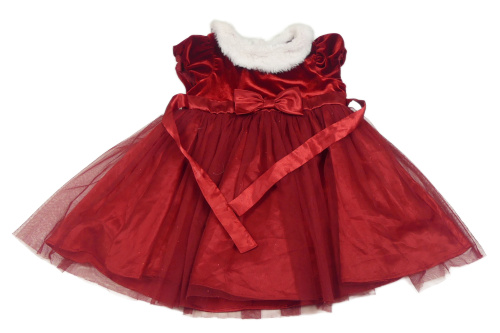 Kockovaným - Červené sametové/tylové šaty s bielým chlpatým golierikom a opaskom
