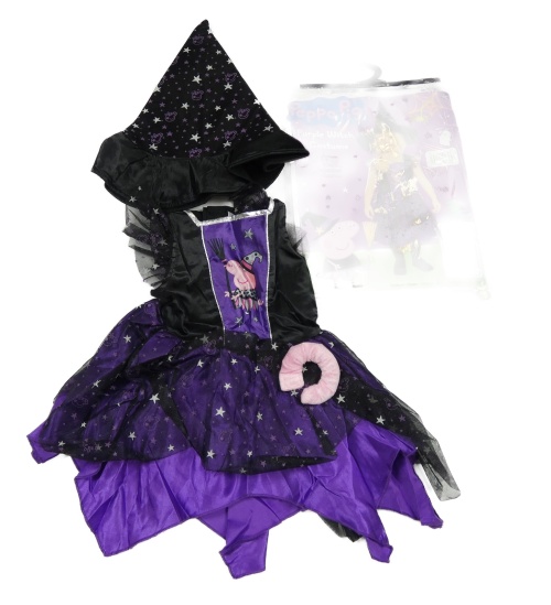 Kockovaným - 2Set - Čierno-tmavofialové saténovo/tylové šaty s Peppa Pig a volánky + klobúk amscan