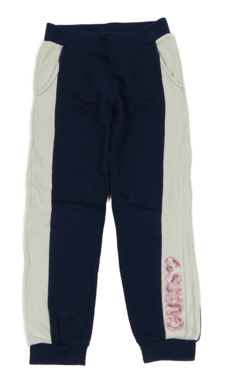 Tmavomodro-biele tepláky s nápisem z flitrů Guess