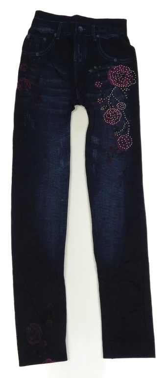 Tmavomodré zateplené legíny riflového vzhledu s kvetmi a kamienkami