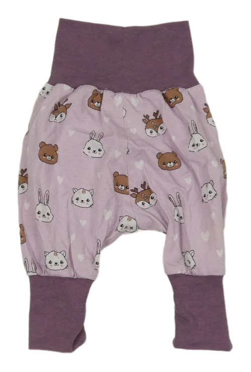 Světlefialovo-tmavofialové turecké tepláky so zvieratkami a srdiečkami