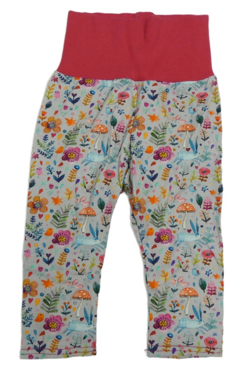 Sivo-rubínové ľahké tepláky s kvietkami a obrázkami