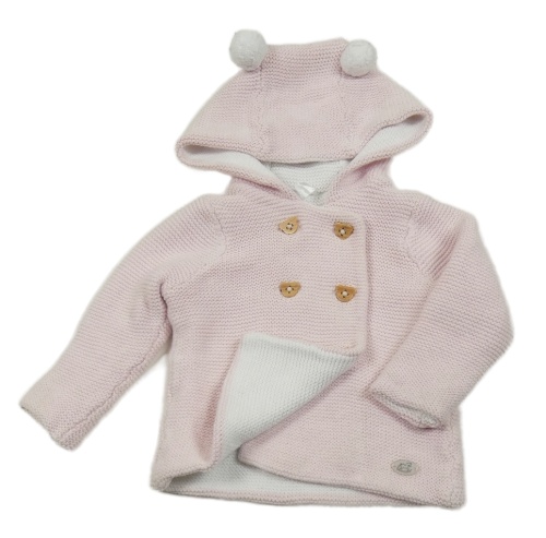 Svetloružový prepínaci sveter s kapucňou s bambulemi