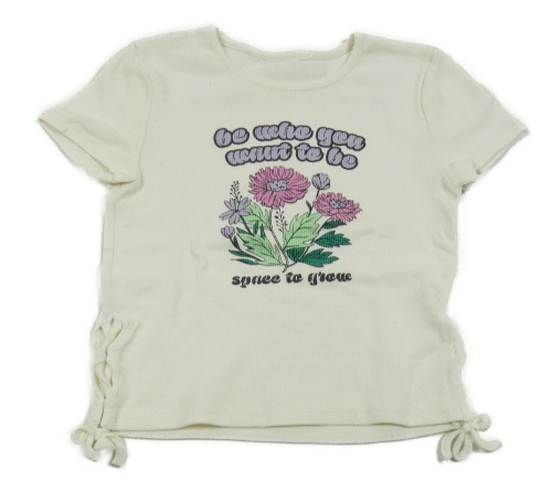 Smotanové rebrované tričko s kvietkami a nápismi a šnurovaním