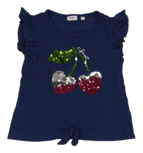 Tmavomodré tričko s třešničkami/srdíčky z překlápěcích flitrů a volánikmi a uzlom BLU KIDS
