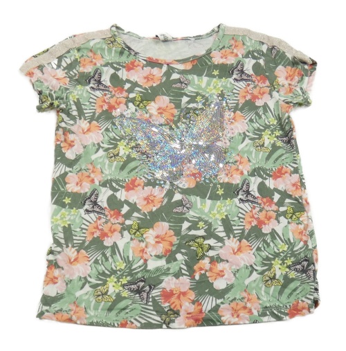 Smetanovo-khaki tričko s kvietkami a lístečky a motýlikmi a flitrami dopodopo