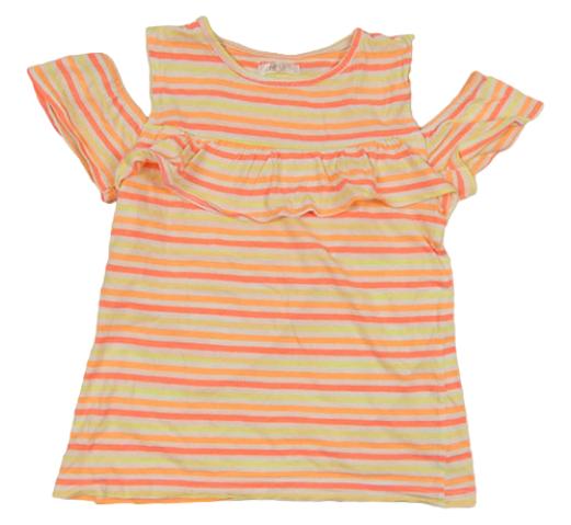 Bielo-neónově farebné pruhované tričko s volánem a prestrihmi