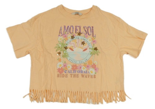Svetlooranžové tričko s palmami a kvetmi a nápismi a flitrami a strapcemi George