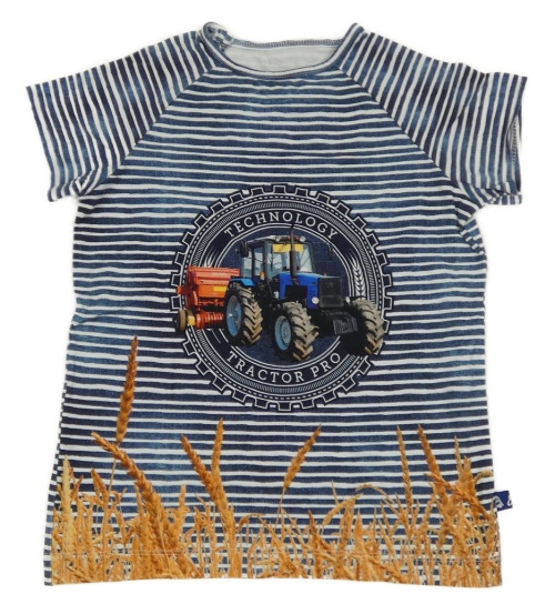 Tmavomodro-biele pruhované tričko s traktorom