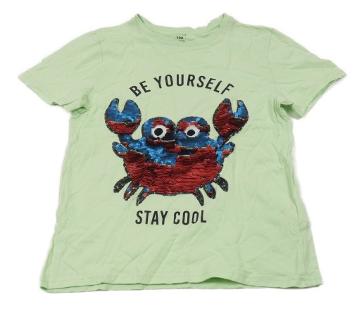 Svetlozelené tričko s krabem z překlápěcích flitrů a nápismi KIABI