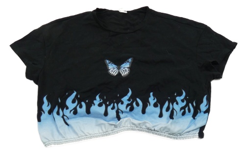 Čierne crop tričko s motýlom a modrými plameny Shein