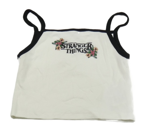Bielo-čierny crop top s nápisem Stranger things a květinami H&M