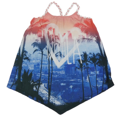 Růžogo-modrý asymetrický top s palmami a nápisom Yigga