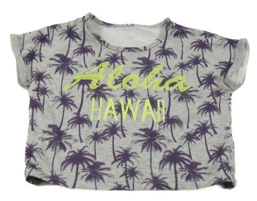 Sivo-fialové teplákové crop tričko s palmami a nápisom