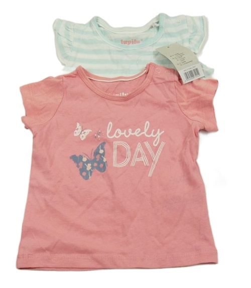Nové - 2x - Tričko - Růžové s motýlikmi a nápisy, bílo/mátové pruhované s volánikmi lupilu