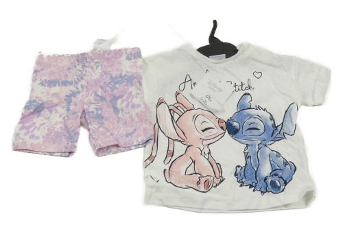 Nové - 2set - Biele tričko so Stitchem a Angel + ružovo-modro-biele batikované elastické kraťasy Disney