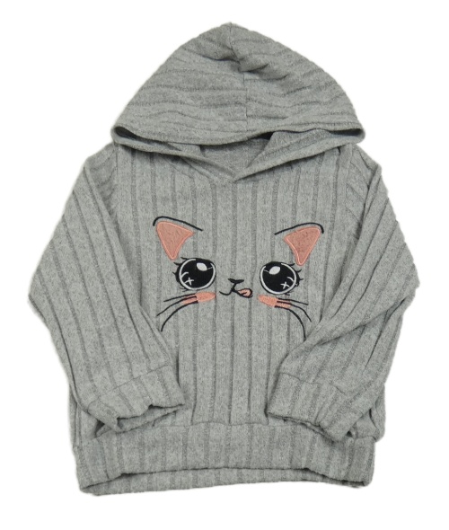 Sivé úpletové rebrované tričko s mačkou a kapucňou