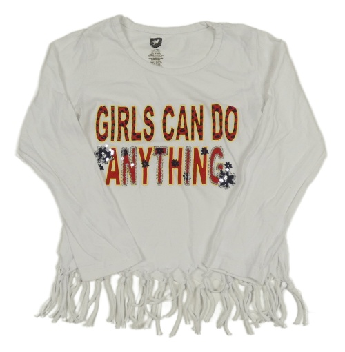 Biele tričko s nápisom s flitrami a strapcemi
