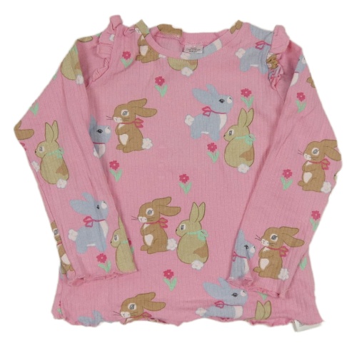 Ružové kvetované rebrované tričko s králikmi a volánikmi