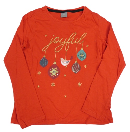 Červené vianočné tričko s ozdobičkami a vtáčikom a zlatým nápisom a vločkami little kids
