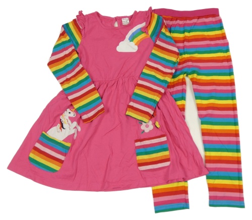 2set - Ružovo-farebná šatová tunika s pruhovanymi rukávy a jednorožcem + farebné pruhované legíny