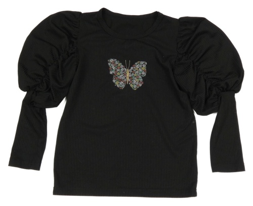 Čierne rebrované tričko s motýlkom a nařasenými rukávy Shein